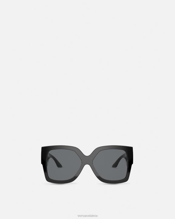 Šīs taisnstūrveida saulesbrilles, kas redzamas uz skrejceļa, ir izcili krāšņi aksesuāri. jaunais dizains lepojas ar platiem tempļiem, kas bagātināti ar ģeometrisku greca aparatūru spīdīgā, zeltainā apdarē. šim stilam ir melns rāmis un tempļi, kas savienoti pārī ar gludām tumši pelēkām lēcām.