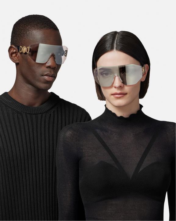šīm platajām saulesbrillēm ir medusa biggie aparatūra pie deniņiem, un tās ir akcentētas ar logotipu pie deguna tilta.