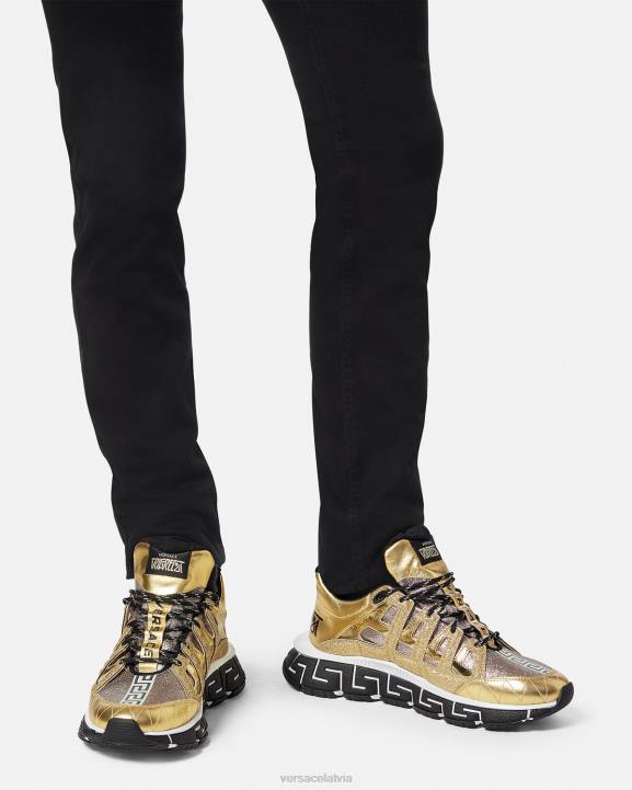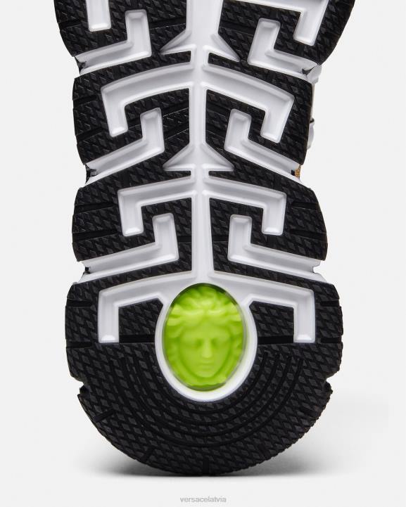 trigreca trenažieri ienes jauninājumus zīmola pastāvīgi mainīgajā estētikā. trīsdimensiju greca izpildījumi uz zolēm piedāvā iespaidīgu piezemēšanos ar "greca amortizācijas sistēmu". izsmalcinātā mājiņā uz Versace dzimto pilsētu, augšdaļās ir diskrēta Milānas koordinātu izdruka.