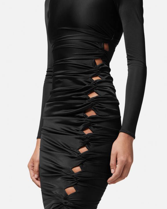 dua lipa ir dua lipa x versace kapsulu kolekcijas viesdizare, kas tapusi sadarbībā ar donatella versace. Šī midi kleita ar garām piedurknēm ir izgatavota no gluda džersija ar izgrieztām mezglu detaļām gar sāniem, lai radītu drapētu efektu.