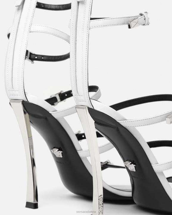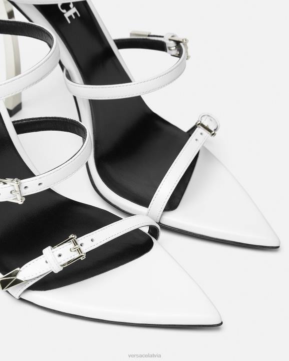 Šīs sandales ar atvērtu purngalu ir izliektas, augsti stiletto papēži un v-veida akcents. stilam ir četras regulējamas augšējās siksnas un fiksēta apakšējā siksna.