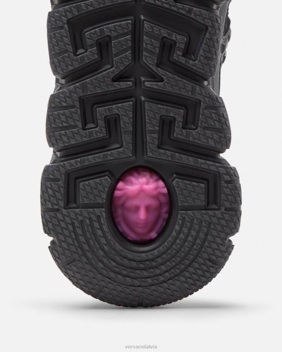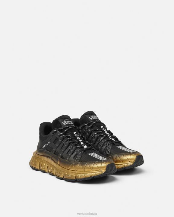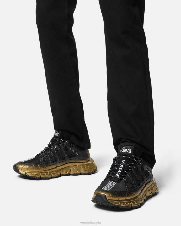 trigreca kedas ienes jauninājumus zīmola pastāvīgi mainīgajā estētikā. ar gradientu dizainu, trīsdimensiju greca izpildījumi uz zolēm piedāvā iespaidīgu piezemēšanos ar "greca amortizācijas sistēmu". izsmalcinātā mājiņā uz Versace dzimto pilsētu, augšdaļās ir diskrēta Milānas koordinātu izdruka.