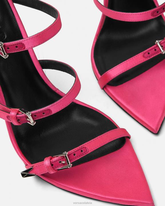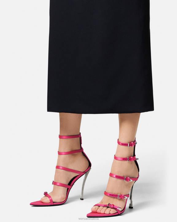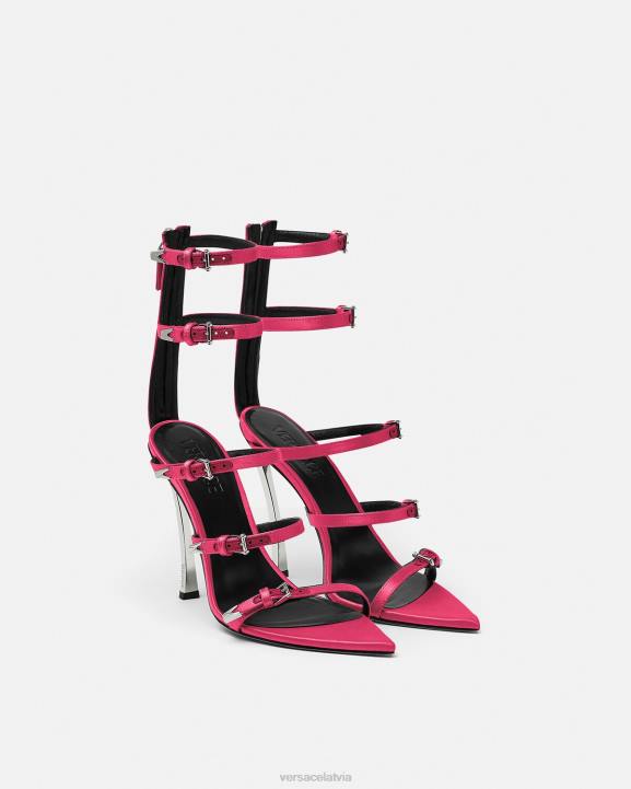 Šīs sandales ar atvērtu purngalu ir izliektas, augsti stiletto papēži un v-veida akcents. stilam ir četras regulējamas augšējās siksnas un fiksēta apakšējā siksna.