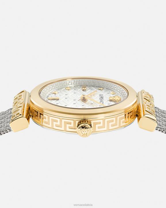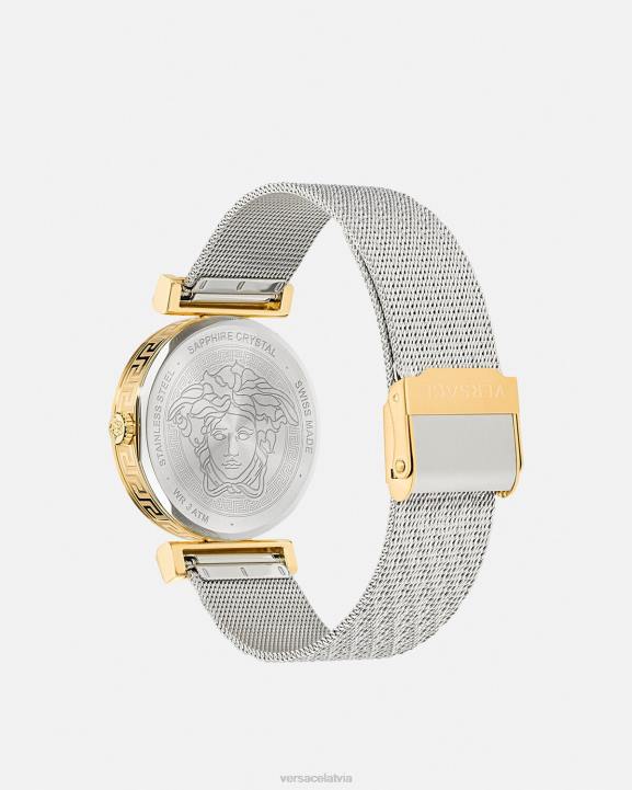 šim izsmalcinātajam pulkstenim ir raksturīgi daudzveidīgi uzraksti uz ciparnīcas ietvariem. ciparnīca ir bagātināta ar trīsdimensiju medūzu 12h un greca rakstu. aksesuārs ir komplektā ar metāla sieta joslu. visiem versace pulksteņiem tiek garantēts marķējums "Šveicē ražots".