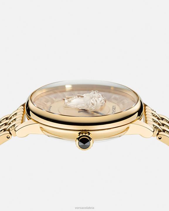 sievišķīgais pulkstenis caurspīdīgā iterācijā atkārtoti apmeklē trīsdimensiju peldošo medūzu. ciparnīca ir bagātināta ar tonālu greca motīvu uz iekšējā gredzena. visiem versace pulksteņiem tiek garantēts marķējums "Šveicē ražots".