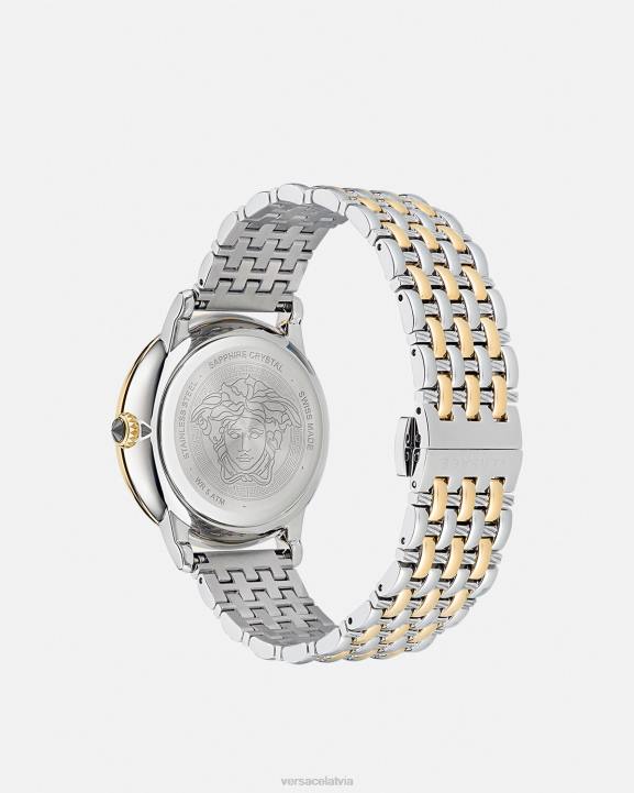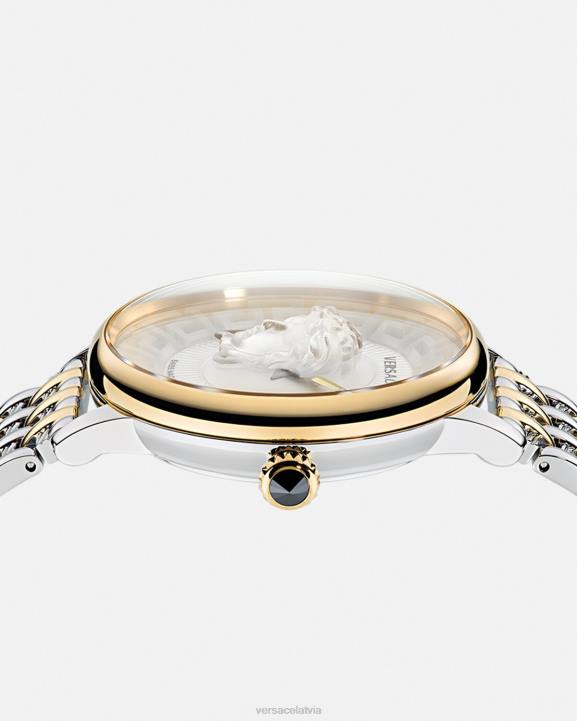 sievišķīgais pulkstenis caurspīdīgā iterācijā atkārtoti apmeklē trīsdimensiju peldošo medūzu. ciparnīca ir bagātināta ar tonālu greca motīvu uz iekšējā gredzena. visiem versace pulksteņiem tiek garantēts marķējums "Šveicē ražots".