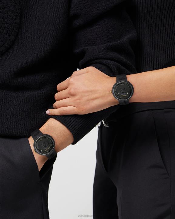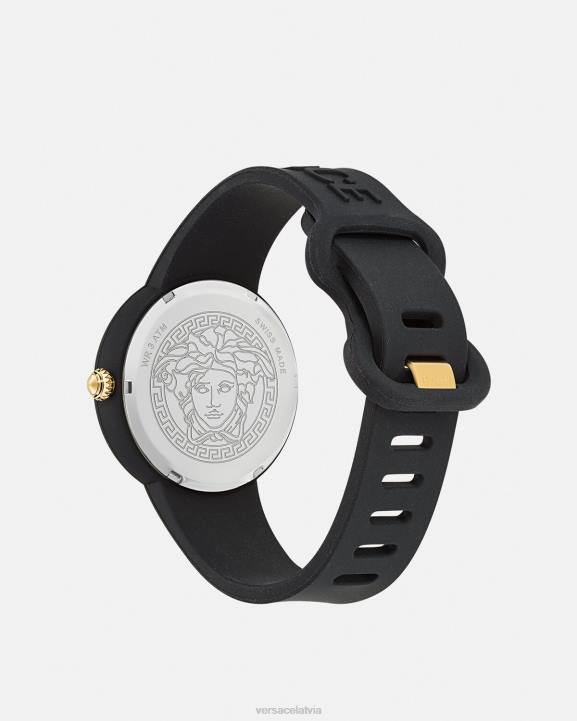 moderns pulkstenis piesātinātās popkrāsās ar tonāliem versace simboliem, tostarp trīsdimensiju medūzu, greca iekšējo gredzenu un versace uzrakstu uz silikona joslas. piederums tiek piegādāts atbilstošā silikona maisiņā. visiem versace pulksteņiem tiek garantēts marķējums "Šveicē ražots".
