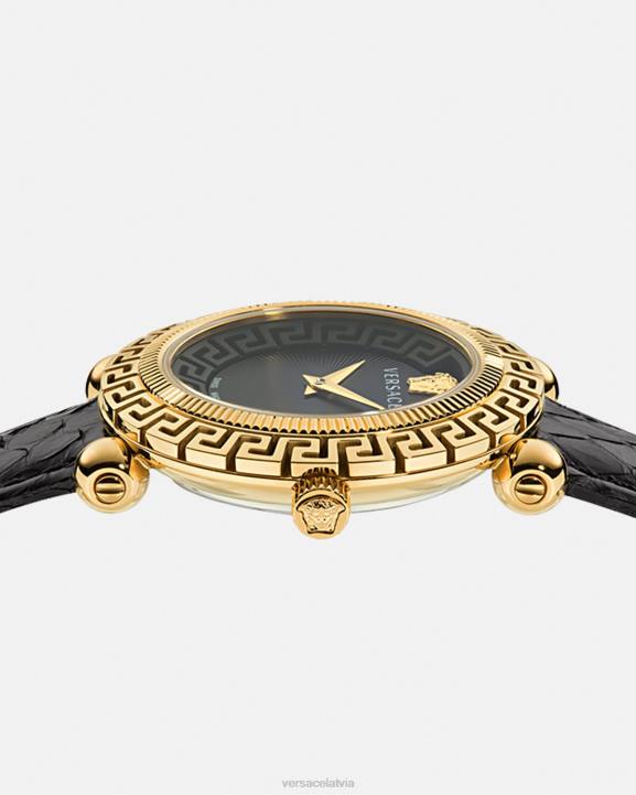 pulkstenis ar zīmola simboliem, tostarp trīsdimensiju medūza pulksten 12 un greca motīvs augšpusē un iekšējais gredzens. aksesuārs ir komplektā ar elaph čūskādas ādas siksniņu. visiem versace pulksteņiem tiek garantēts marķējums "Šveicē ražots".