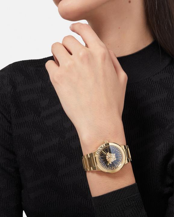 šim elegantajam pulkstenim ir trīsdimensiju medūza, kas atrodas starp diviem kristāliem ar divu roku kustību sistēmu. uz iekšējās ciparnīcas ir greca raksts, savukārt korpusu ierāmē iegravēts versace uzraksts pie gredzena. piederums ir pabeigts ar metāla lenti.