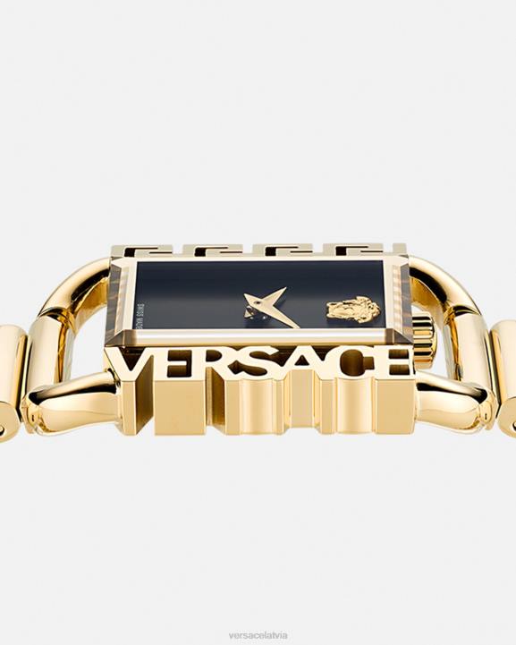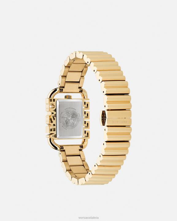 elegants pulkstenis, kam raksturīgs taisnstūra korpuss ar ažūra greca un versace burtiem, kas ierāmē ciparnīcu. sievišķīgajam pulkstenim ir medūza pulksten 12 un divu roku kustību sistēma. metāla lente ar tauriņa aizdari un stūmējiem papildina piederumu.