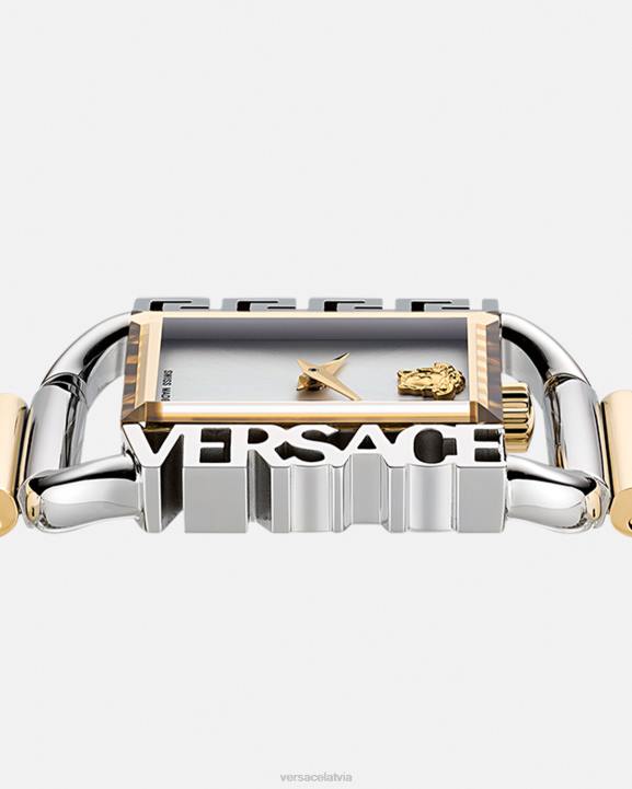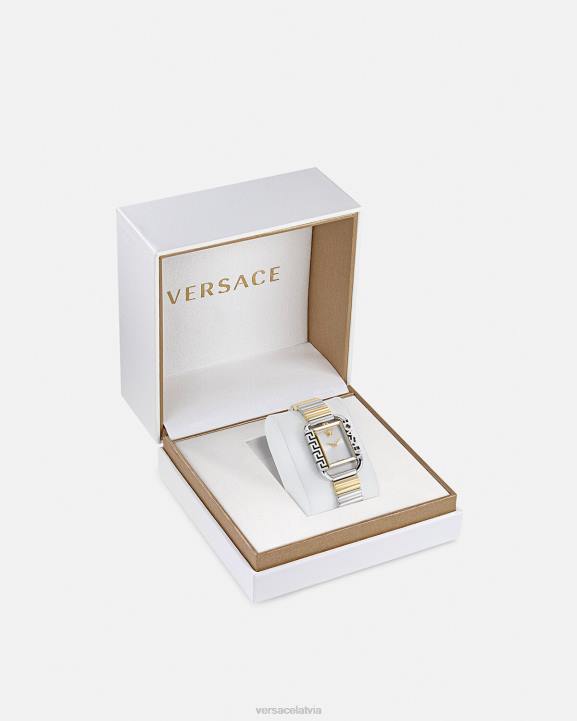 elegants pulkstenis, kam raksturīgs taisnstūra korpuss ar ažūra greca un versace burtiem, kas ierāmē ciparnīcu. sievišķīgajam pulkstenim ir medūza pulksten 12 un divu roku kustību sistēma. metāla lente ar tauriņa aizdari un stūmējiem papildina piederumu.
