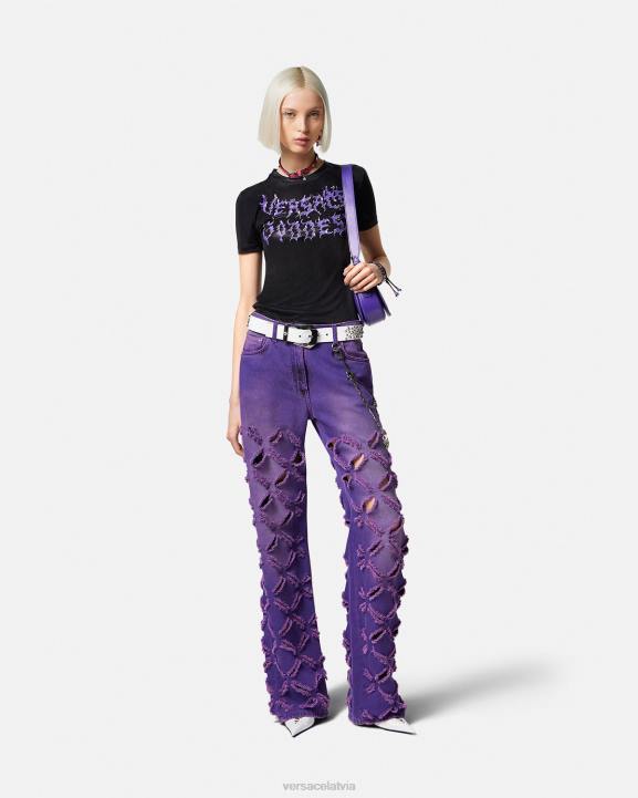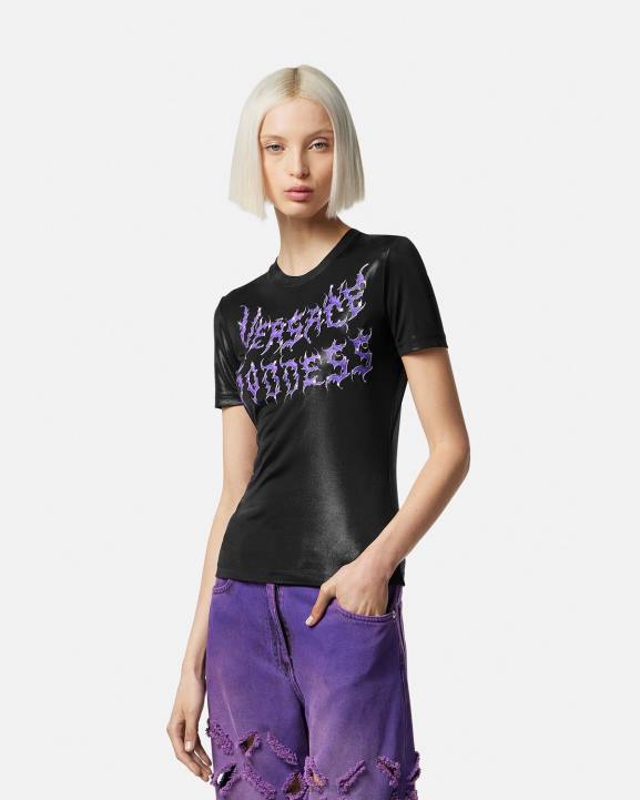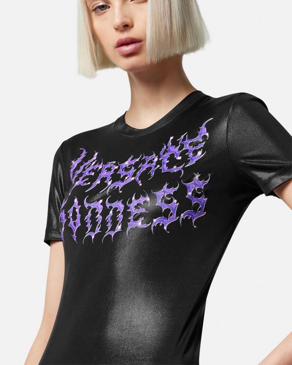 T-krekls ar īsām piedurknēm, kas ir piegriezts slaidā piegriezumā un kura priekšpusē ir uzliesmojošs "versace goddess" logotips grunge versace malai.
